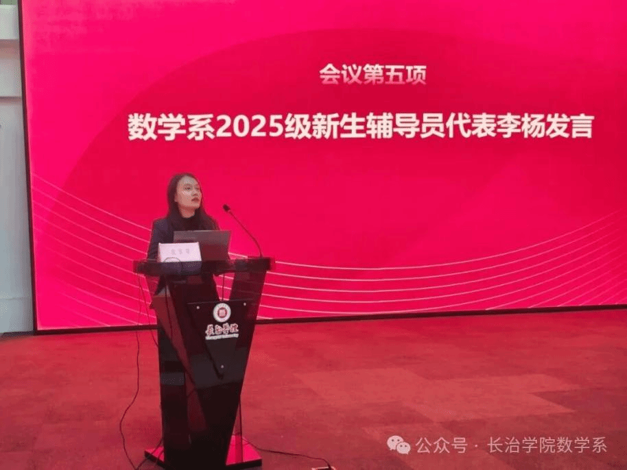 数学系2025级新生辅导员代表李杨分享了辅导员的工作内容与职责,表达了对新生的关怀与期望,她承诺会陪伴大家度过大学时光,助力大家解决学习和生活中的困难,鼓励新生们勇敢追求梦想,积极探索自我。