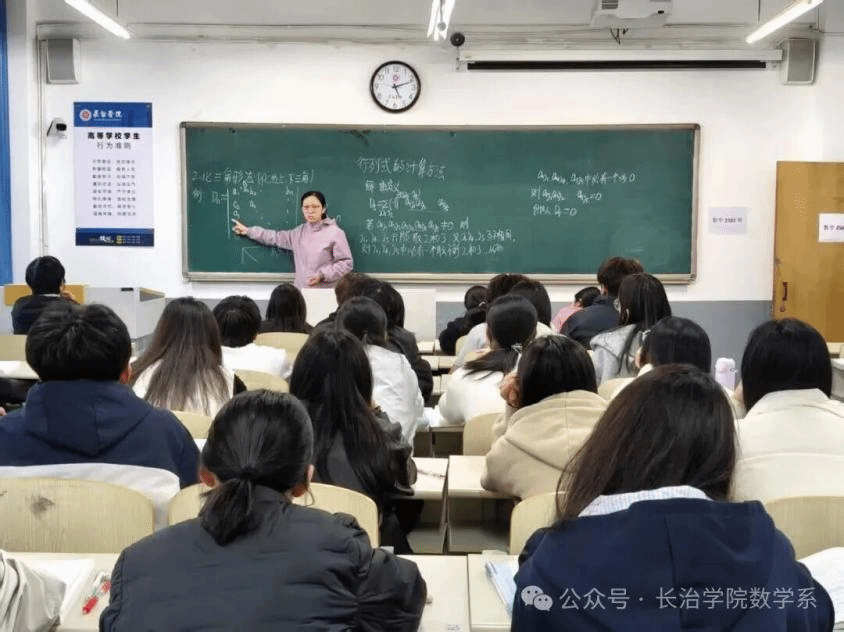 课程开篇,老师从行列式定义切入,结合基础习题回顾展开教学。逐行逐列的展开过程让同学们体会到数学的“严谨性”——元素代数余子式需精准计算,符号判断不容马虎,恰如学习生活,唯有扎实根基方能应对复杂问题。随后,老师重点讲解了化三角形法。通过行、列变换将复杂行列式转化为上三角或下三角形式,利用主对角线元素之积求解,诠释了“转化与化归”思想,告诉同学们面对难题不必强攻,巧妙转化便可高效破解。