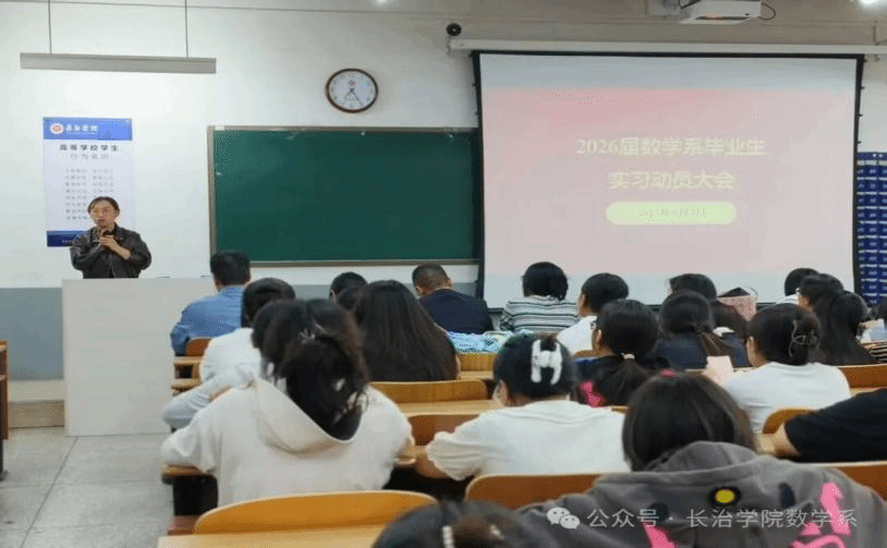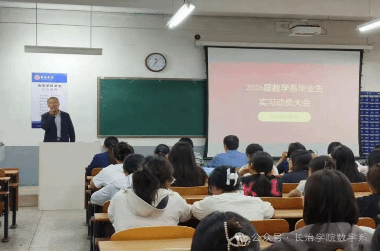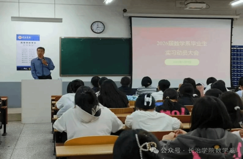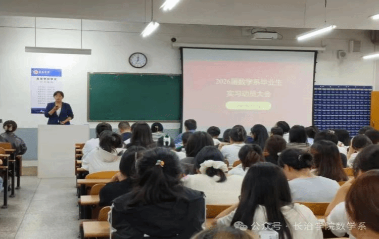 实习是连接校园与社会的重要桥梁,也是实现从理论走向实践的关键一步。为扎实做好数学系2026届毕业生教育实习工作,助力同学们明确实习目标、把握实习要点,我系于9月7日晚19:00在逸夫教学楼东003教室隆重举行2026届教育实习动员大会。本次大会由团委书记贾武艳老师主持。
