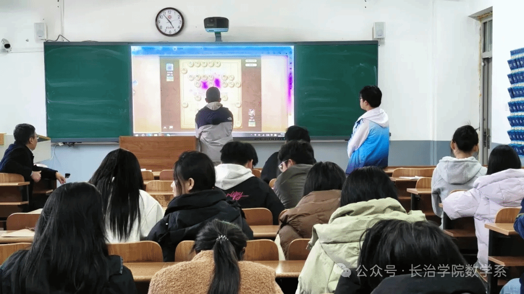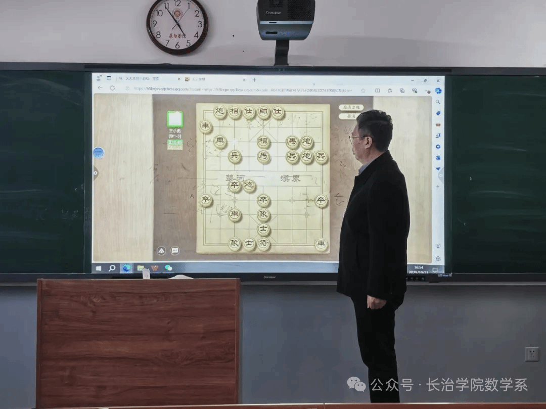活动现场,指导老师王慧群为同学们带来了生动的象棋知识分享。他不仅细致讲解了下棋的核心要点与行棋规则,清晰阐释“楚河汉界”的意义及“将死即输”的判定标准,还通过多媒体屏展示高水平象棋演示对局。同学们沉浸式观摩博弈过程,看棋手如何运筹帷幄、见招拆招;王老师还与大家现场拆解经典棋路,分享背后的策略思考,带领同学们领略棋盘间深邃的逻辑之美与计算魅力。