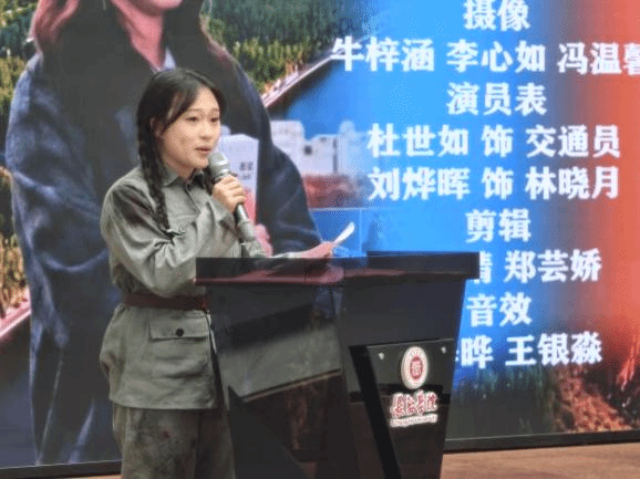 现场还特别展播了由我系师生创作的太行精神红色短剧《穿越烽火的铭记》。主创团队学生代表郭佳敏、杜世如现场分享了从剧本打磨到拍摄制作的创作感悟,讲述了团队在光影创作中深化对太行精神理解的幕后故事。