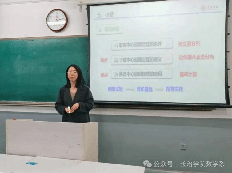 随后,党红老师着重引导同学们挖掘数学定理背后的哲学内涵与社会价值。她阐释了中心极限定理所体现的“从量变到质变”“从偶然到必然”的辩证唯物主义思想,并结合统计学在社会经济、国情调研等领域的广泛应用,强调了数学工具服务社会发展的现实意义,鼓励学生树立学以致用、贡献社会的学术志向。