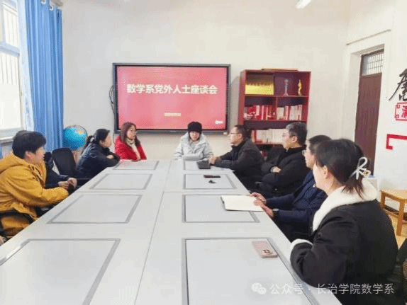 12月9日下午,数学系党委召开党外人士座谈会,广泛征求党外教师对系部党建、教学科研、学生管理等工作的意见建议。系党委书记王永岗,系党委副书记、主任王慧群,系党委副书记郭晓晓,副主任郭伟、邢艳元与全系党外教师参会,会议由王永岗主持。